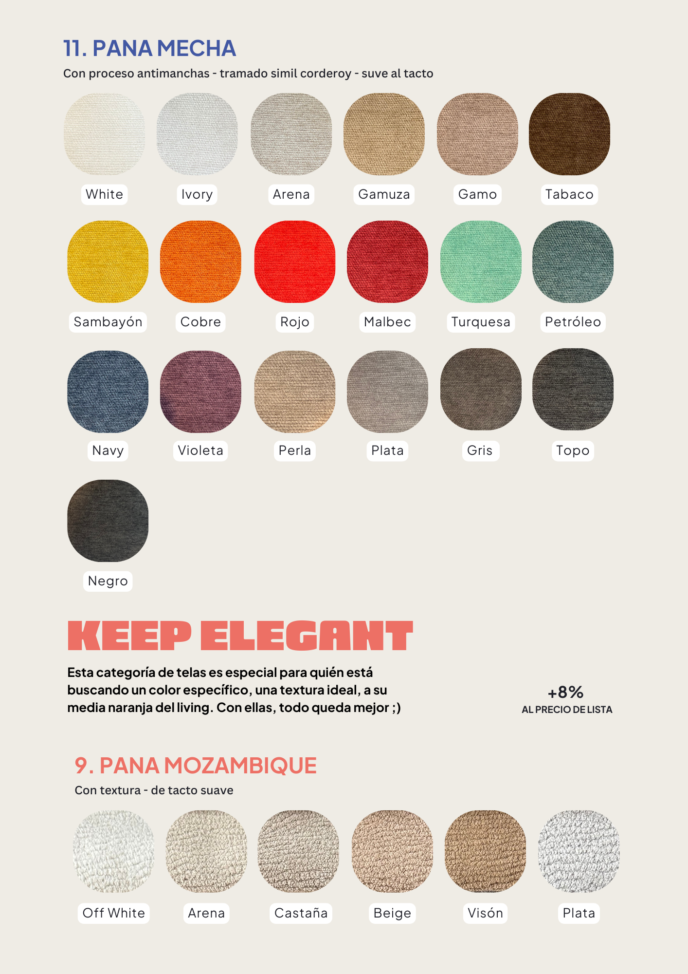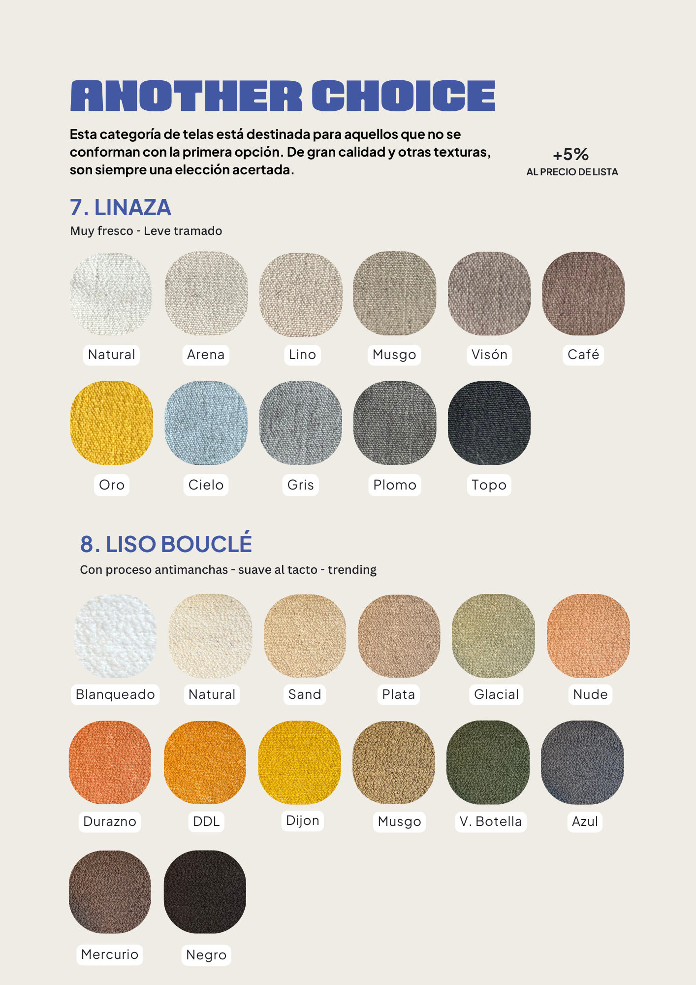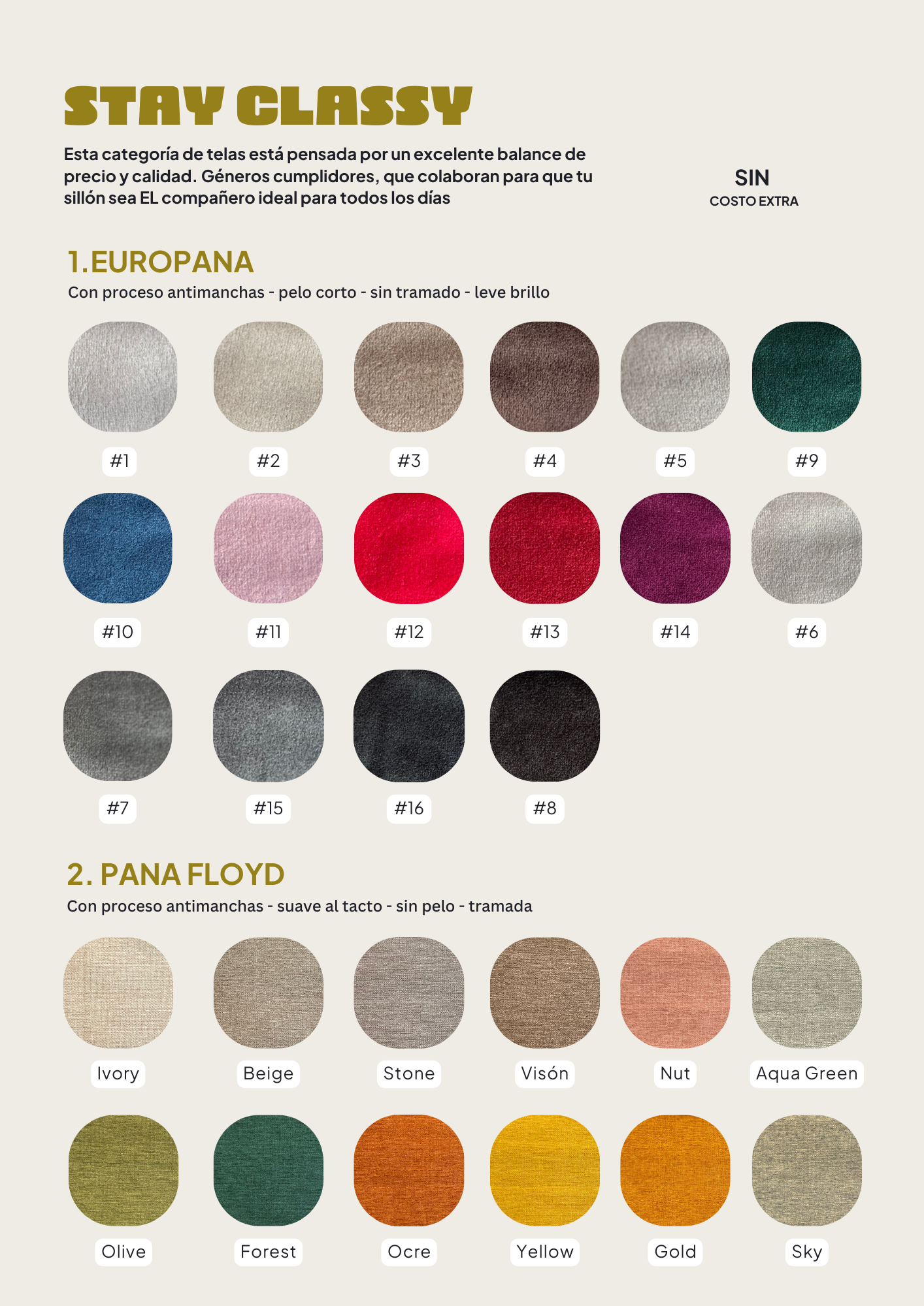 Todos nuestros sillones de la línea Trendy se pueden tapizar en los siguientes géneros, tené en cuenta que el precio base tiene incluída la categoría Stay Classy, si elegis un tono de la categoría Another Choice se suma un 5% a tu compra, y si elegís la categoría Keep Elegant un 8%.
